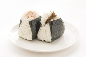 Bentuk nasi menjadi segitiga, isi tengahnya dengan ayam.
